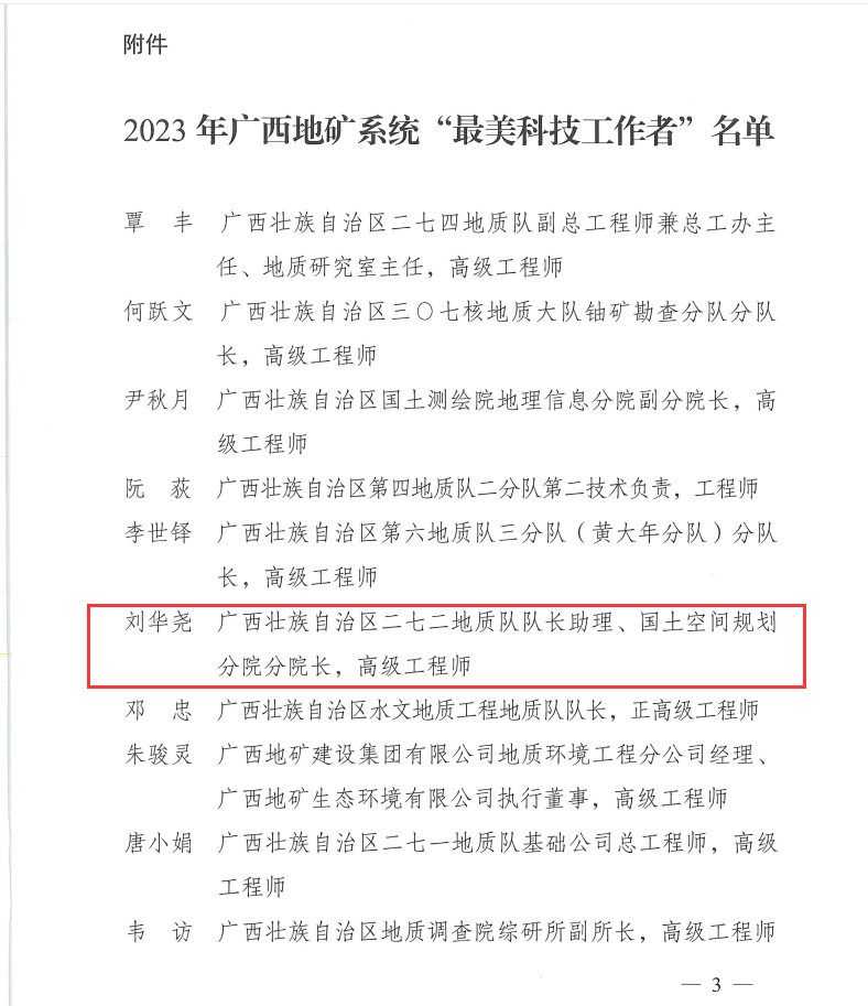 本网讯(张白雪 报道)近期,我院刘华尧同志荣获了2023年度广西地矿系统“最美科技工作者”荣誉称号!下一步,我院将以更加饱满的工作热情和严谨务实的科学精神,积极投身到伟德国际1946的实践中,推动我院地矿科技进步再立新功、再创辉煌。(编辑:张白雪;校对:廖德好;审核:翁敦贤)