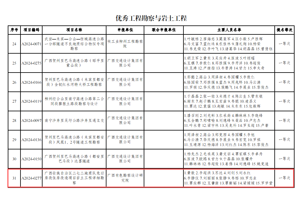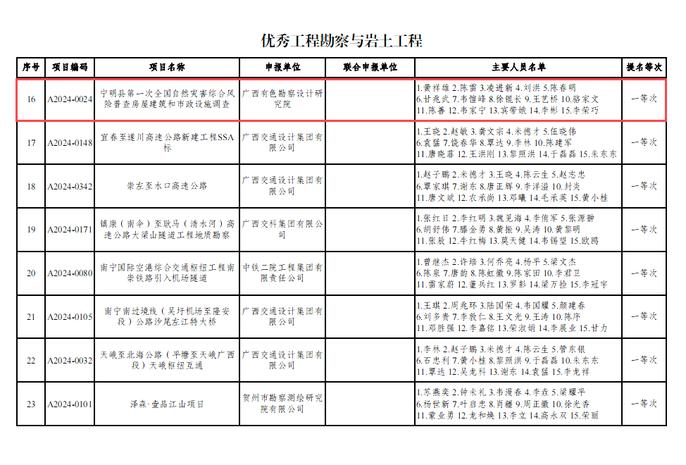 本网讯(罗梦莹 报道)近日,我院承接的宁明县第一次全国自然灾害综合风险普查房屋建筑和市政设施调查、广西壮族自治区二七二地质队危旧房改住房改造项目岩土工程详细勘察项目在2024年度广西优秀工程勘察设计成果等次评定中荣获一等次。