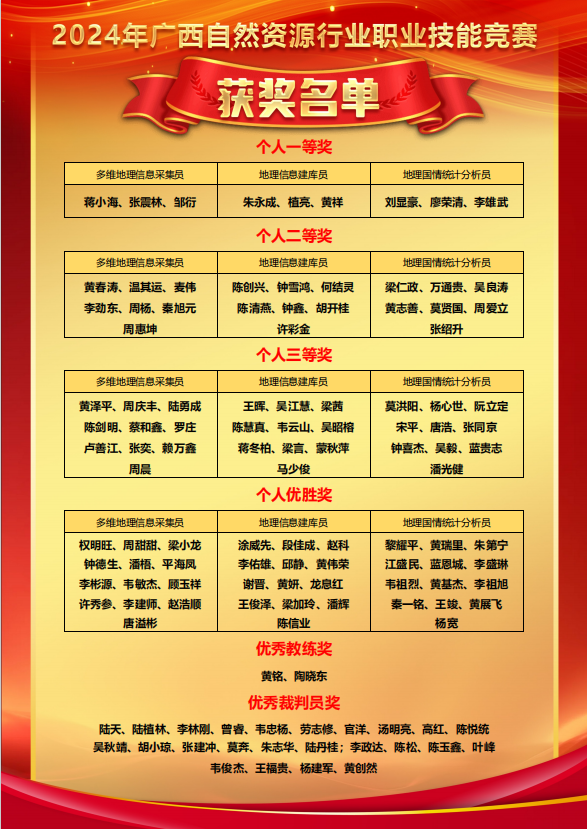 本网讯(尹军 报道)近日,我院荣获2024年广西自然资源行业职业技能竞赛团体二等奖,黄泽平、周晨两位同志荣获了个人三等奖。荣获广西壮族自治区自然资源厅“南方测绘杯”第八届广西测绘地理信息行业技能竞赛暨第八届全国测绘地理信息行业职业技能竞赛选拔赛团体三等奖,韦家宁、蓝必存两位同志荣获了广西测绘地理信息技术能手称号,有力展现了我院技术人员扎实的专业技能。(编辑:张白雪;校对:廖德好;审核:翁敦贤)