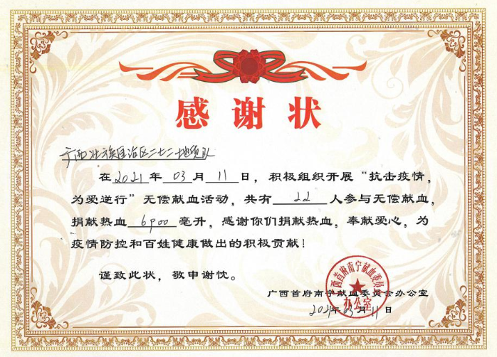 为响应南宁市“志愿者集体献血月”号召,弘扬雷锋精神,3月11日,我队(院)邀请血站到该队大院开展了义务献血公益活动。